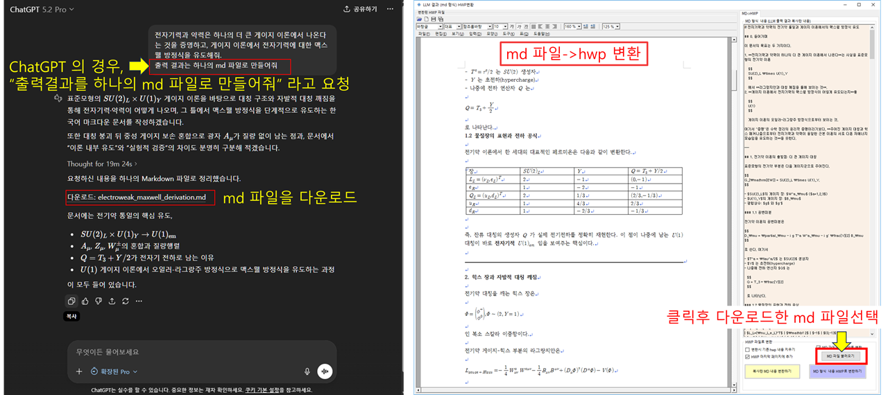 에듀허브를 활용하면 LLM의 출력 결과(Markdown)를 수식과 표의 형태를 완벽하게 유지한 채 HWP 파일로 쉽게 변환할 수 있습니다. (수식은 한글 수식 스크립트로 완벽하게 호환됩니다.)